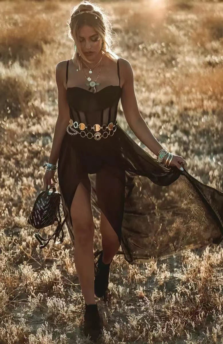 Product positioning: This is a sheer long dress that combines extreme sensuality and elegance. It is crafted from lightweight net fabric to create a subtle and dreamy aesthetic effect. It is suitable for private dates, party banquets, or artistic photo shoots, showcasing confident and charming feminine charm.